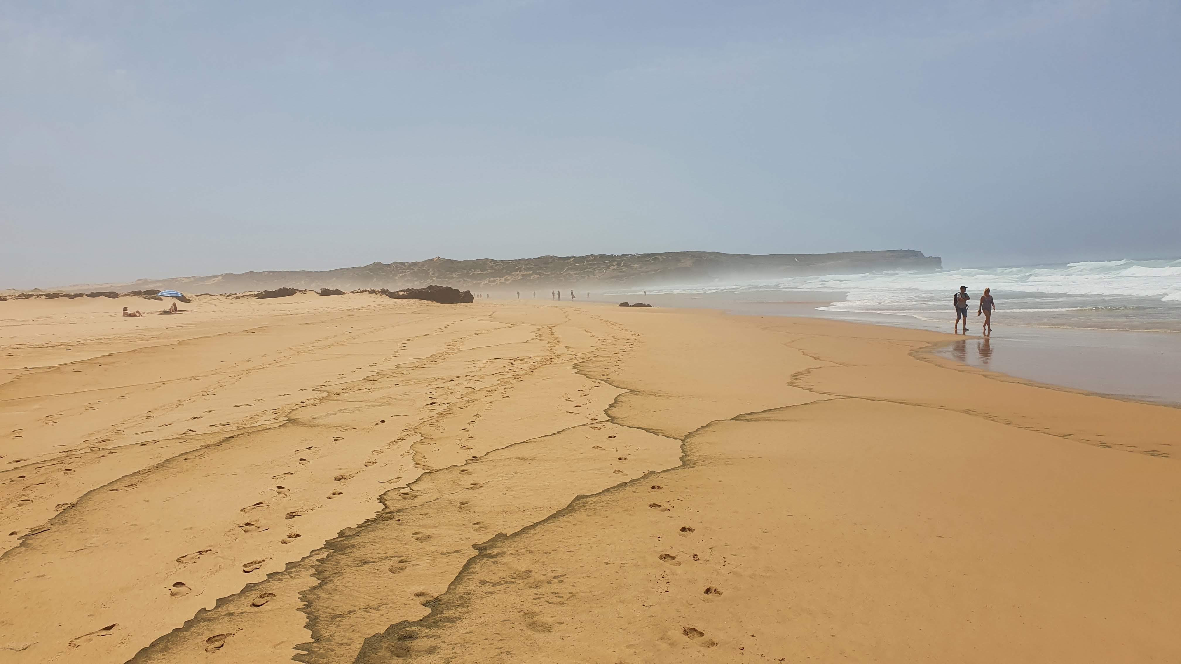 Schon seit 9 Tagen bin ich unterwegs auf der Rota Vicentina, heute ist mein 8. offizieller Tourtag. Die Reise neigt sich langsam dem Ende zu, aber ein paar Tage hab ich noch. Ich war heute 21km unterwegs und es war wieder gut heiß und auch steil und sandig. Es gab aber viel Abwechslung was das Laufen angenehmer gemacht hat. Auf genau der halben Strecke tauchte mitten im Nirgendwo wie aus dem Nichts eine kleine Reihe Ferienbungalows auf, wo es eine kleine Bar gab die mich mit kalten Getränken und Schatten versorgte. So gestärkt hab ich auch den restlichen Weg gut gemanagt bekommen, das letzte Stück bis kurz vor dem Ort auf einem großen und breiten Strand. Frisch geduscht und gleich in das kleine Örtchen Carrapateira zum Abendessen. In einen von 3 Restaurants habe ich Andreas aus Norddeutschland und Daniel aus dem südlichen Bayern wieder getroffen und sehr leckere Pizza gegessen. Die Erkenntnis des Tages, es wäre schön nicht immer nur alleine zu laufen.